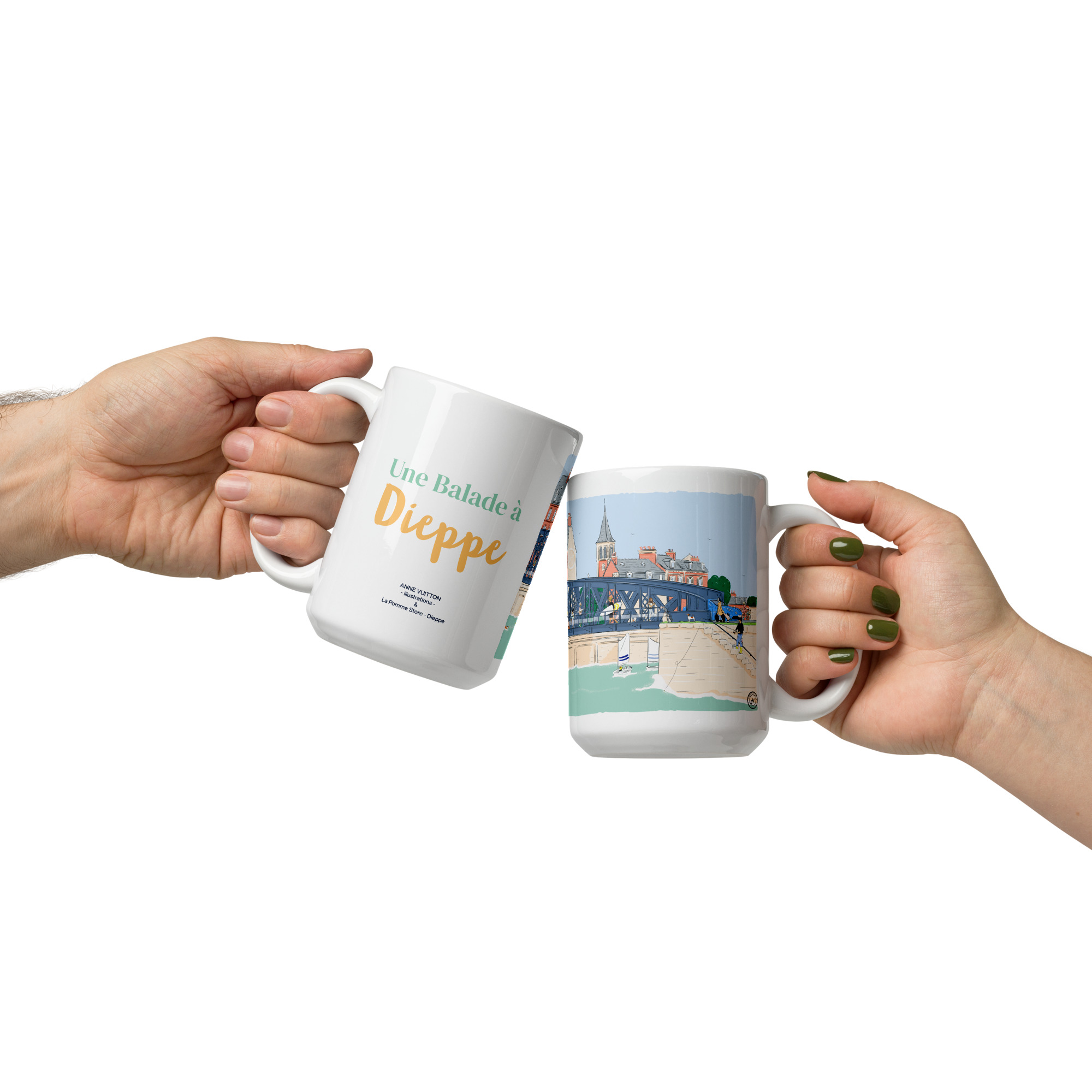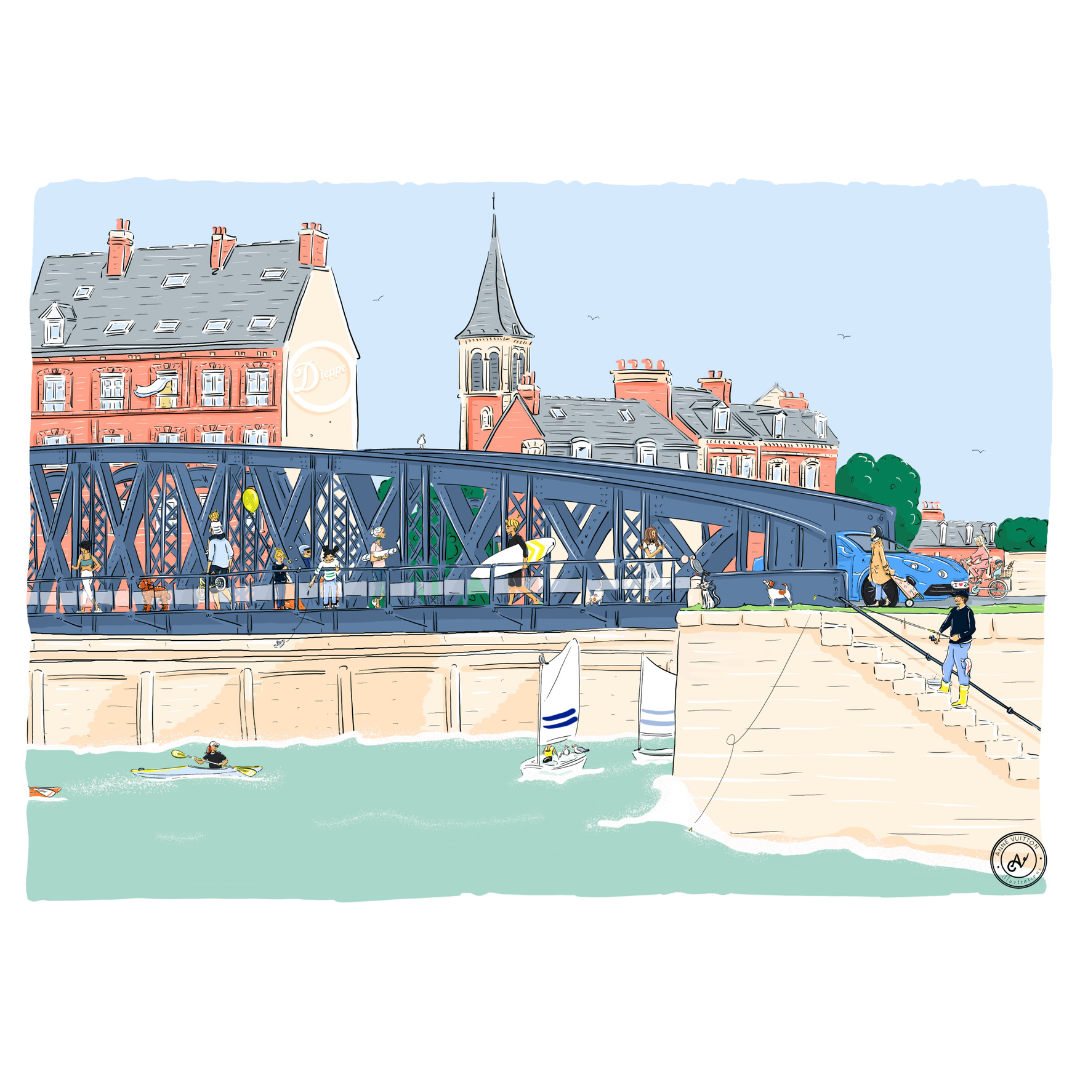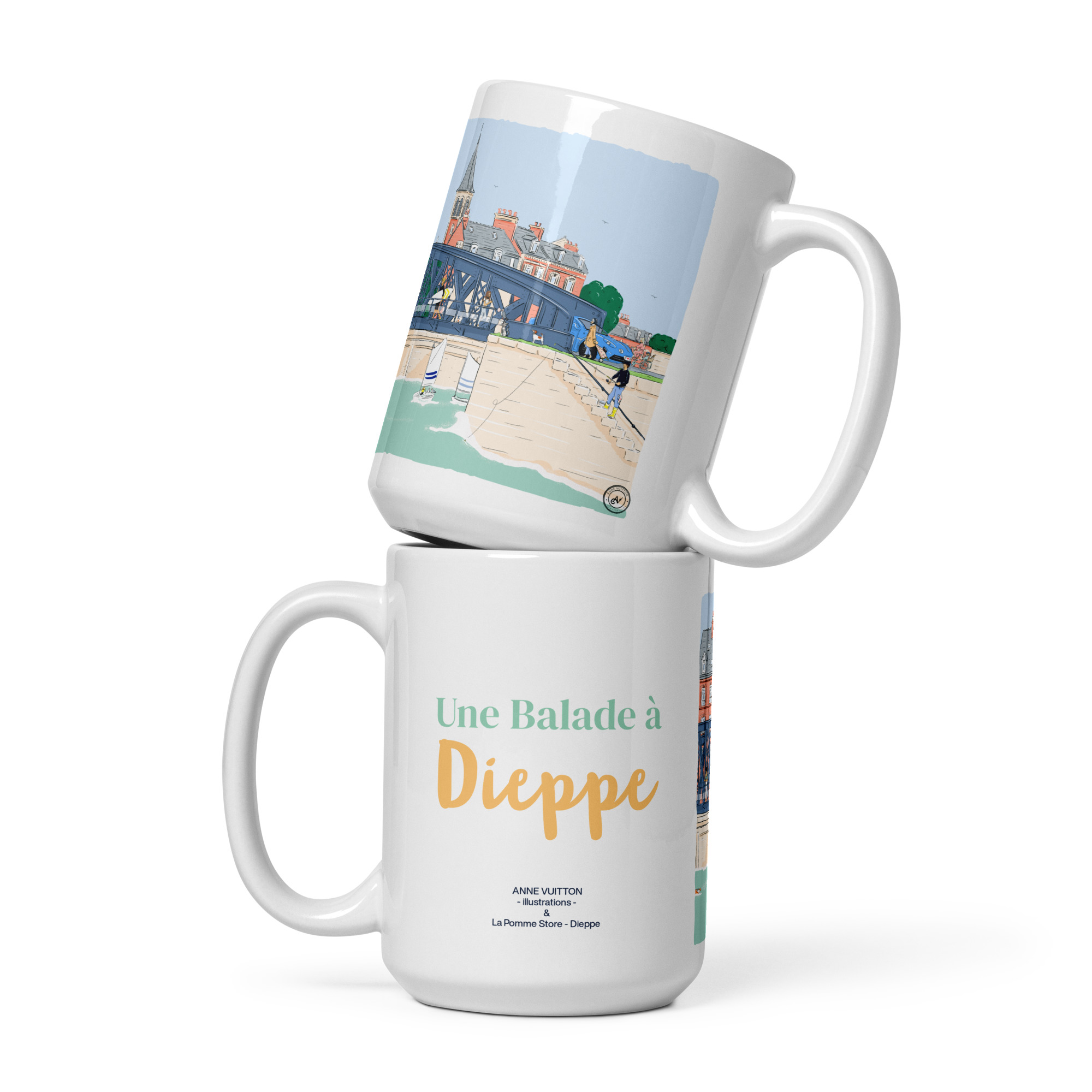 Ce mug illustré par Anne Vuitton met à l’honneur le célèbre Pont Colbert de Dieppe, symbole emblématique du patrimoine maritime normand. À travers une illustration originale au trait délicat, l’artiste capture le caractère unique de ce pont tournant historique, véritable lien entre la ville et son port.